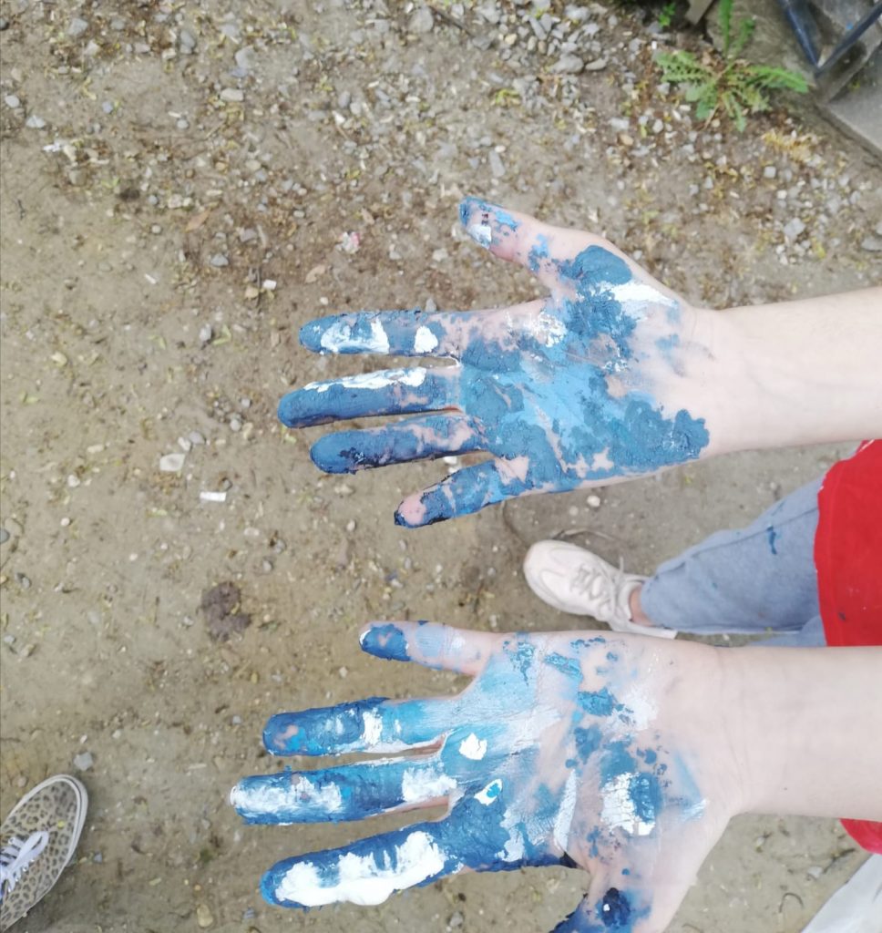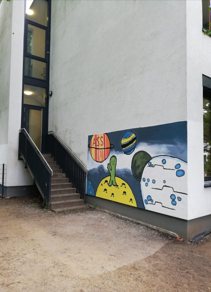 Die Schülerinnen und Schüler aus dem Profilfach Kreativität haben gemeinsam die Außenwand des C-Gebäudes gestaltet. Es wurden zuerst alle Ideen zu einer Zeichnung zusammengefügt. Anschließend haben die kreativen 5. Klässler die Wand mit gesponserter Fassadenfarbe bemalt.