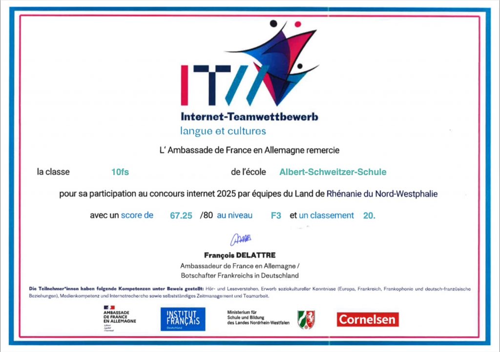 Als krönender Abschluss haben wir am 22.01.2025 an dem Französisch-TeamWettbewerb teilgenommen “ und was sollen wir sagen? Unter 271 Klassen sind wir auf Platz 20 gekommen! Ein echtes Highlight und ein Beweis dafür, dass wir nicht nur Spaß haben, sondern auch richtig was draufhaben.